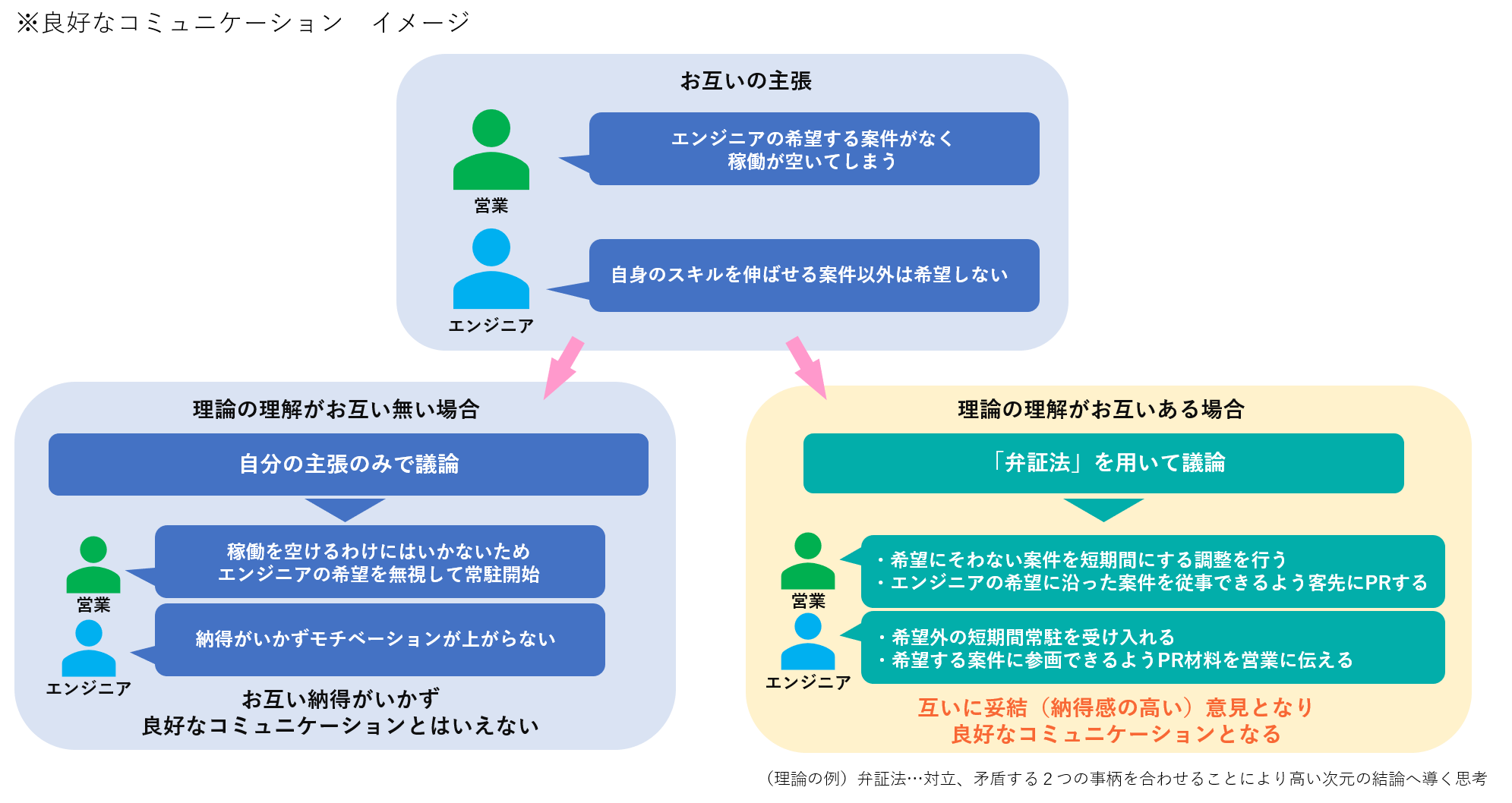 個人の価値観は様々です。よく目にするのは懇親会などコミュニケーションをとる機会を増やすことが良好なコミュニケーションを行うための手段としています。 しかし本当にそれだけで良好なコミュニケーションが取れるのでしょうか?当社は良好なコミニュケーションをとるための秘訣は、 世間一般的な理論を理解しあった上でのコミュニケーションこそ良好となると確信しております。
